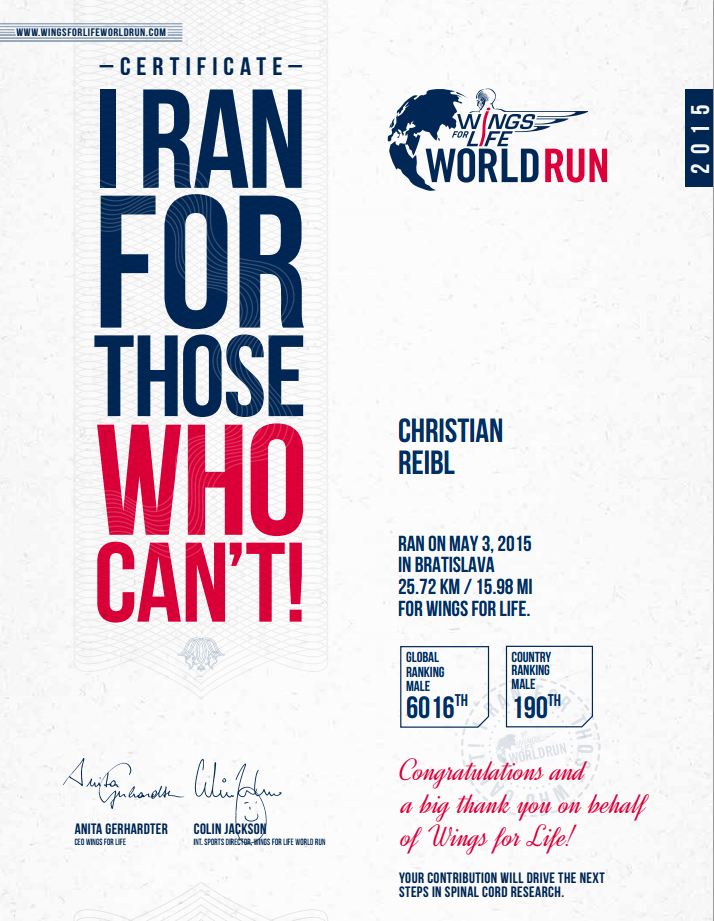 Auch beim Wings For Life World Run waren RATS AMSTETTEN Athleten am Start. Mangels Fotoservice hier stellvertretend eine Urkunde eines RATS AMSTETTEN Athleten.